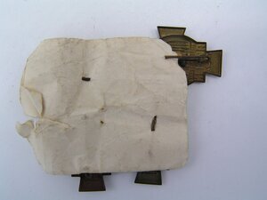 Die 4 gleichen Pilgerabzeichen aus gestanztem Messingblech zeigen in einem Oval den Aachener Dom. Das Oval wird flankiert von den 4 Armen eines breiten Kreuzes. Oberhalb der Abbildung des Aachener Doms befindet sich eine Königskrone, unterhalb steht "HEILIGTUMSFAHRT / AACHEN / 1937". Die Abzeichen sind auf der mit einer einfachen Nadel zum Anstecken in die Kleidung versehen. Die Pilgerabzeichen sind auf einem zweifach gefalteten Papier mit den Nadeln befestigt. Die 4 großen Aachener Reliquien - das Lendentuch Jesu, die Windel Jesu, ein Kleid von Maria und das Enthauptungstuch von Johannes dem Täufer - werden alle 7 Jahre gezeigt. Die Seide, in der die Reliquien in diesem Zeitraum geruht haben, werden zu Andenken verarbeitet und an die Pilger verkauft. Auch im Kloster St. Clara wurden Andenken für die Aachener Heiligtumsfahrten hergestellt. Herkunft: Devotionalienwerkstatt des Klosters St. Clara, Petrisberg, Trier, 1920 - 2018