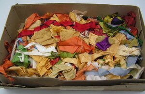 Karton mit Stoffresten für die Herstellung von Wallfahrtsandenken und Reliquienbildern