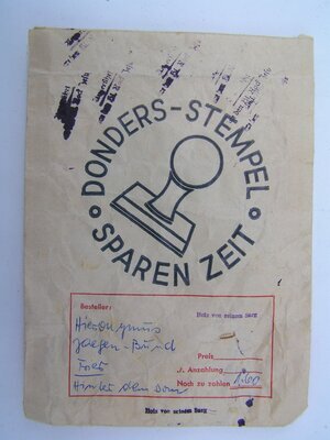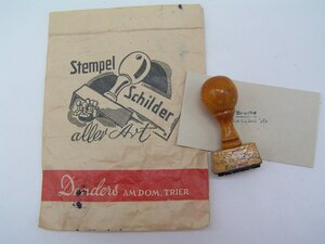 Stempel mit der Aufschrift "Angerührt [unterstrichen] / an den hl. Rock Jesu". Die letzte Zeile mit den Angaben "Trier 1933", wie es außen auch angeführt ist, wurde sichtbar entfernt. Hergestellt hat den Stempel aus Holz und Hartgummi die Firma Donders, ihr Name und Adresse (Hagelstraße 83 in Trier) steht seitlich auf dem Stempel. Gegenüber steht der ehemals vollständige Text des Stempels mit Zeit- und Ortsangabe. Eine originale Papiertüte ist noch vorhanden. Hierauf macht der Firma Donders auf der Vorderseite Werbung für "Stempel Schilder aller Art", darunter stehen Name und Adresse der Firma. Auf der Rückseite ist ein Stempel abgebildet in einem Schriftkreis "DONDERS STEMPEL SPAREN ZEIT". Darunter ist ein Feld, in das die Daten eines Bestellers und der Preis der Ware eingetragen werden kann. Als Besteller ist jedoch der Hiernoymus Jaegen-Bund in Trier Hinter dem Dom angegeben. Über die Tüte verteilt finden sich im oberen Teil Spempeladrucke "Angerührt an den Hl. Rock Jesu" und "Holz von seinem Sarge". Diese Stempelabdrucke wurden im Kloster St. Clara im Kontext der Fertigung von Reliquien- und Andenkenbilder getätigt. Herkunft: Devotionalienwerkstatt des Klosters St. Clara, Petrisberg, Trier, 1920 - 2018