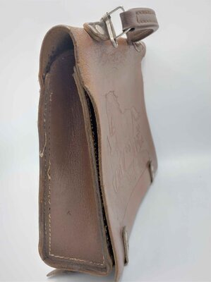 Die Schultasche, oder auch der Schulranzen ist aus dunkelbraunem Leder gefertigt und sie besitzt auf Vorderseite ein eingeprägtes Pferdemotiv Der Deckel der Tasche konnte ursprünglich mit zwei Schnallen am unteren Rand der Vorderseite geschlossen werden, jedoch ist eine Schnalle kaputt. Wahrscheinlich besaß die Tasche auch Träger um sie auf dem Rücken zu tragen, denn man erkennt die Stellen, an denen sie vermutlich angenäht waren. Die Tasche besitzt jedoch noch einen Handgriff oben am Deckel. Der Innenraum der Tasche besteht aus einem einzigen großen Fach. Es finden sich keinerlei Prägungen oder Aufkleber, die einen Hinweis auf den Hersteller geben. Der Deckel der Tasche ist auf seiner Innenseite bunt (vermutlich) mit Filzstiften angemalt und beschrieben. Was genau dort steht ist heute aber nicht mehr so gut zu lesen, es scheinen aber Unterschriften zu sein.