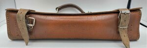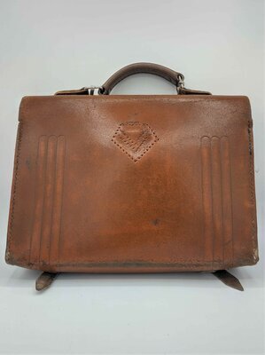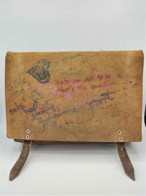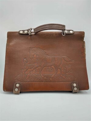 Die Schultasche, oder auch der Schulranzen ist aus dunkelbraunem Leder gefertigt und sie besitzt auf Vorderseite ein eingeprägtes Pferdemotiv Der Deckel der Tasche konnte ursprünglich mit zwei Schnallen am unteren Rand der Vorderseite geschlossen werden, jedoch ist eine Schnalle kaputt. Wahrscheinlich besaß die Tasche auch Träger um sie auf dem Rücken zu tragen, denn man erkennt die Stellen, an denen sie vermutlich angenäht waren. Die Tasche besitzt jedoch noch einen Handgriff oben am Deckel. Der Innenraum der Tasche besteht aus einem einzigen großen Fach. Es finden sich keinerlei Prägungen oder Aufkleber, die einen Hinweis auf den Hersteller geben. Der Deckel der Tasche ist auf seiner Innenseite bunt (vermutlich) mit Filzstiften angemalt und beschrieben. Was genau dort steht ist heute aber nicht mehr so gut zu lesen, es scheinen aber Unterschriften zu sein.