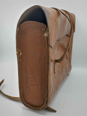 Die Schultasche, oder auch der Schulranzen ist aus hellbraunem Leder gefertigt und besitzt ein Muster aus geraden, senkrechten Linien und Strichen, welche keiner erkennbaren Richtung folgen. Vorne in der Mitte konnte der Deckel vermutlich an einer Schnalle festgemacht werden, doch die Schnalle fehlt. Die Träger waren am Boden der Tasche auf der einen Seite mit einer Schnalle befestigt und auf der anderen Seite konnte der Träger einfach ein- und wieder ausgehängt werden. So ließ sich die Tasche leichter an- und wieder ausziehen. Besonders an dieser Tasche ist, dass die Träger nicht auf der Rückseite der Tasche festgemacht sind, sondern dort lediglich durch einen metallenen Ring gezogen wurden und über den Deckel der Tasche hinaus gingen, wo sie auf der Vorderseite der Tasche, in Höhe der Deckelschnalle rechts und links festgenäht sind. Das bedeutet, dass die Träger, erst immer nach rechts und links vom Deckel heruntergenommen werden mussten, damit der Deckel geöffnet werden konnte. Die Träger sind heute jedoch gerissen. Der Innenraum der Schultasche besteht aus einem einzigen Fach. Es sind keinerlei Prägungen oder Ähnliches vorhanden, was Aufschluss über den Hersteller geben könnte.