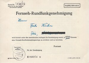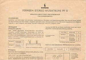 Ein 12 seitige Bedienugsanleitung im 2 Farben-Druck (Orange-Weiss) erstellt. Das Format ist DIN A 5 hoch. Die Einstellung des Fernsehers ist teilweise durch Bilder unterstützt. Für den Rundfunk und Phonoteil sind es grafische Darstellungen. Technische Daten sind nicht Bestandteil der Anleitung. Neben der Bedienungsnleitung finden sich in den Unterlagen noch die Rundfunkgenehmigung, ausgestellt auf Herrn Fritz Kühn, aus Trier. Erhalten geblieb sind auch die Abgleich-Anleitung für den Rundfunkteil im DIN A 4 Format und der Verdrahtungsplan der Musiktruhe. (Siehe auch LINK zur Musiktruhe PF 12)