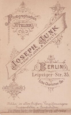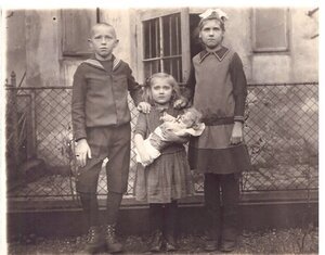 Zu sehen sind zwei Kinder, ein Junge und ein Mädchen, im Fotolabor. Das Mädchen sitzt, links neben dem Jungen, auf einem Stuhl und hält eine Puppe im linken Arm. Sie trägt eine brustlange Kette um den Hals. Ihr Kleid ist etwas über knielang, und am unteren Ende mit zwei umlaufenden, dunklen Streifen verziert. Der Junge zu ihrer Rechten trägt eine Jacke, die in der Mitte nur locker geschlossen ist. Weiterhin ist er mit einer knielangen Hose, langen Strümpfen und halbhohen Schuhen bekleidet. Unter dem Foto sind der Name und der Sitz des Fotoateliers vermerkt.