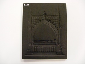 Eisenguss; Relief; Hochformat; Nachguss; Die ursprünglich für das Neujahr 1829 auf der Sayner Hütte hergestellte Plakette bzw. Neujahrskarte zeigt als Motiv das Grabmal des Erzbischofs Kuno II. von Falkenstein (gestoben 1388) in der Basilika St. Kastor in Koblenz. Sie ist am unteren Rand der Vorderseite beschriftet mit "GRABMAL CUNO´S V: VALCKENSTEIN IN DER KIRCHE ST: CASTOR ZU COBLENZ". Es handelt sich hierbei um einen Nachguss aus den 1970er Jahren von der Kunstgießerei Buderus Hirzenhain. Modell: Heinrich Zumpft, Sayn. Vergleiche Leihgabe: Röntgen Museum Neuwied, vormals Kreismuseum Neuwied (Inv.-Nr. Roentgen 4610).