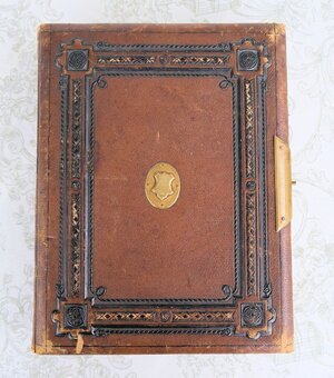 Ledergebundenes Fotoalbum mit kleinem Wappenschild