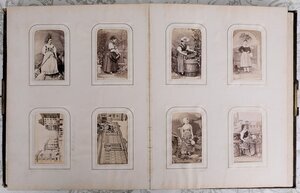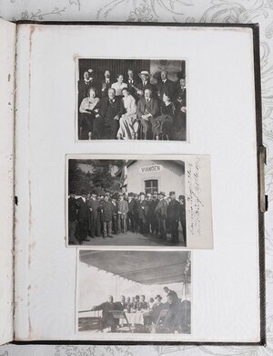 Ein sehr schwers, in braunes Leder gebundenes Fotoalbum. Deckel und Rücken sind mit Muster, rechteckig eingerahmt. Zudem ist ein kleiner Wappenschild aus Messing auf der Vorderseite befestigt. Die 15 Seiten sind aus 2mm starker Pappe gefertigt, die Passepartout für Bilder der Größe 6,5 x 9,5 cm beinhalten. In unserem Exemplar sind nur wenige Seiten belegt. Auf der letzten Seite ist eine Postkarte eingeklebt, die von einem Kegelausflug nach Vianden im Sept. 1913 berichtet.