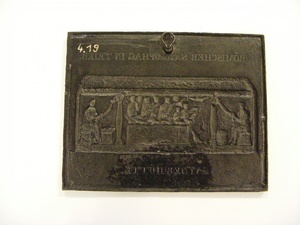 Eisenguss; geschwärzt; Querformat; Relief; Nachguss; Carl Osterwald lieferte den Entwurf für eine Plakette, die anfangs als Neujahrsplakette vorgesehen war. Das Motiv zeigt einen Sarkophag in Trier, der verziert ist mit einer Darstellung, die bisher als Augurenfamilie oder Fahrt der Götter auf dem Nil interpretiert wurde. Osterwald konnte mittels seiner Zeichnungen und einer genauen Beschreibung feststellen, dass es sich hierbei um Noah, also ein biblisches Motiv handelt. Der Sarkophag zeigt in der Mitte das nach links ausgerichtete, kastenförmige Schiff mit Bug, in dem Noah die mit einem Ölzweig wiederkehrende Taube begrüßt. In der für das Noahmotiv ungewöhnlich figurenreichen Darstellung werden zusätzlich diverse Familienmitglieder sowie Begleittiere dargestellt. Der Sarkophag, dessen Deckel nicht erhalten ist, ist auf der vorderen Langseite durch zwei Säulen in drei Blickfelder unterteilt, in den beiden äußeren sind nackte, Girlanden flechtende Knaben zu sehen. Der Noah-Sarkophag stammt aus einer spätantiken Grabkammer des südlichen Gräberfeldes um St. Matthias vor der Stadt Trier. Er ist der wohl bekannteste Sarkophag nordgallischer Produktion. Der Originalsarkophag aus Sandstein gehört zum Bestand des Landesmuseums Trier. Das Oberbergamt in Bonn beschloss zwar die Plakette zu produzieren, so wurde sie bei Anwesenheit des Kronprinzen auf der Sayner Hütte am 18.11.1833 auch als Geschenk überreicht, allerdings wurde sie nicht als Neujahrskarte herausgegeben. Zu diesem Zweck wählte man für das Neujahr 1833 das Hochkreuz von Godesberg aus. Diese Plakette, bei der es sich um einen Nachguss aus den 1970er Jahren der Kunstgießerei Buderus in Hirzenhain handelt, ist auf der Vorderseite oben mit "RÖMISCHER SARKOPHAG IN TRIER." und unten mit "SAYNERHÜTTE." beschriftet. Entwurf: Carl Osterwald. Modell: Heinrich Zumpft. Vergleiche Leihgabe: Röntgen Museum Neuwied.