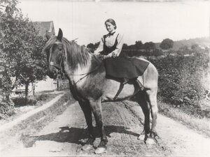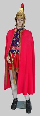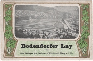 Diese Rosette ist aus 6 verschieden großen gezackten Filzstücken in den Farben dunkelblau, braun, rostrot (2 Mal), schwarz und grün gearbeitet. Sie sind nicht ganz mittig mit einem roten Faden und einem Perlmuttknopf zusammengenäht. Herkunft: Devotionalienwerkstatt des Klosters St. Clara, Petrisberg, Trier, 1920 - 2018
