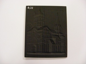 Eisenguss; geschwärzt; Hochformat; Nachguss; Die ursprünglich für das Neujahr 1838 auf der Sayner Hütte hergestellte Neujahrskarte zeigt eine Ansicht der Stifts- und Münsterkirche St. Quirin in Neuss von Südwesten. Der Entwurf dieser Plakette muss nach einer alten Druckgrafik erstellt worden sein, da der dargestellte achteckige Turm bereits im Jahre 1747 bei einem Brand vernichtet und durch eine Kuppel ersetzt wurde. Es handelt sich bei dieser Plakette um einen Nachguss aus den 1970er Jahren der Kunstgießerei Buderus in Hirzenhain. Die Neujahrsplakette ist unten beschriftet mit "STIFTSKIRCHE ST. QUIRIN IN NEUSS." Modell: Carl Christian Kramer. Vergleiche Leihgabe: Röntgen Museum Neuwied (Inv.-Nr. Roentgen 4738).