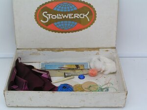 In einer großen Schachtel von der Schokoladenfirma "Stollwerk" befinden sich diverse Utensilien, wie sie die Schwestern aus dem Kloster St. Clara für die Herstellung von Deotionalien benutzt haben: größere Stücke roter Samtstoff, 1 Rolle blaues Stickgarn (in dem Papierschildchen steckt noch eine Nähnadel), 1 kleines Knäuel lachsfarbenes Stickgarn, 1 Fingerhut mit Stempel "16" als Größenangabe für die Öffnung (Durchmesser: 1,6 cm), eine dickere weiße hölzerne Nadel (Durchmesser: max. 0,8 cm), Fadenreste in grün, blau und lachsfarben, 2 Wattebäusche, 4 runde Pappscheiben unterschiedlicher Größe, einer davon ist mit einem Stoff überzogen, der in der Mitte ein gelbes Kreuz zeigt und eine Skizzierung für ein weiteres Dekor, ein blauer geschliffener halbkugeliger Glasstein und zwei Kartonstreifen. Sperrholz, Karton und Papier gearbeitet, der aufklappbare Deckel ist mit einem Stoffstreifen außen nachträglich nochmals befestigt worden. Auf seiner Vorderseite steht handschriftlich geschrieben "Stickereimuster", auf der rechten Seite "runde und 4eckige Reliefs". Auf der linken Seite befindet sich noch der Rest eines originalen Aufklebers von Stollwerk mit einer Angabe "G 18" Herkunft: Devotionalienwerkstatt des Klosters St. Clara, Petrisberg, Trier,1920 - 2018