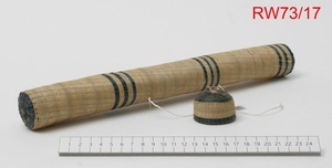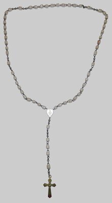 Das kleine Konvolut besteht aus 2 kleinen Stückchen von roter und rosa Seide, in denen Reliquien geruht hatten, und aus einem Stück Borte mit goldfarbenen Spiraldrähten, von denen etliche Stücke abgeschnitten wurden, und zwei Stücken goldfarbenes Staniolpapier. Außerdem ist noch ein Rest von einem Brillenbügel vorhanden; er besteht aus einem sprialförmig gedrehten, vergoldetem Metall. Herkunft: Devotionalienwerkstatt des Klosters St. Clara, Petrisberg, Trier, 1920 - 2018