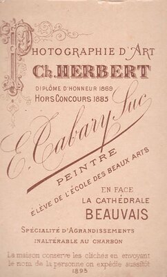 Zu sehen ist ein größeres Mädchen, das in einer im Studio aufgebauten Naturszenerie sitzt. Die Haare des Kindes sind lang, und werden in der Mitte des Kopfes von einer Spange zusammengehalten. Sie trägt ein langes Kleid, welches im Brustbereich aufwändig verziert ist. In der linken Hand hält sie einen kleinen Blumenstrauß mit den Blüten nach unten. Die Rechte trägt einen Korb mit langem Henkel, der ebenfalls mit Blumen gefüllt ist. Die Beine sind übereinandergeschlagen. An ihnen sind zweifarbige Schuhe zu sehen. Unter dem Foto sind der Name und der Sitz des Fotoateliers vermerkt.