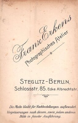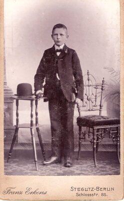 Zu sehen ist ein etwa zwölfjähriger Junge im Fotoatelier. In der rechten Hand trägt er ein Paar Handschuhe, in der linken ein Gebetsbuch. Es ist davon auszugehen, dass der Junge seine erste heilige Kommunion gefeiert hat. Er stützt sich mit der rechten Hand leicht aus einen kleinen Tisch, auf dem bereits eine Melone liegt. Zu seiner Linken steht ein Stuhl mit verzierter Rückenlehne. Hinter dem Jungen wurde eine Leinwand gespannt, auf der eine Säule aufgemalt ist. Unter dem Foto sind der Name und der Sitz des Fotoateliers vermerkt.