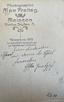 Zu sehen ist ein weiblicher Teenager im Fotoatelier. Sie hat die Hände um eine Stuhllehne gelegt, auf die man ein verziertes Tuch gelegt hat. Die junge Frau trägt ein langes Kleid, welches die Taille betont. Der Kragen ist hochgeschlossen und mit Spitzen besetzt. Die Haare sind lang und lockig. Auf dem Kopf ist eine Schleife zu sehen. Das Foto ist auf ein Stück Pappe geklebt. Auf der Vorder- und Rückseite sind der Name und der Sitz des Fotoateliers zu sehen. Unter diesen Daten wurde noch eine persönliche Widmung geschrieben.