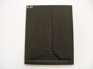 Eisenguss; geschwärzt; Relief; Hochformat; Nachguss; Die Plakette zeigt das sog. gotische Hochkreuz in Bonn - Bad Godesberg. Hierzu hatte Bernhard Hundshagen seine Entwürfe bereits im Jahre 1824 eingereicht. Aufgrund des vermuteten 500jährigen Jubiläums (1333) wurde dieses Motiv erst für das Jahr 1833 ausgewählt (Zeichnung: Bernhard Hundshagen; Modell: Heinrich Zumpft). Bei dieser Plakette handelt es sich um einen Nachguss der 1970er Jahre aus der Kunstgießerei Buderus in Hirzenhain. Sie ist wie folgt beschriftet: "Saynerhütte 1833. / Hoch-Kreuz bey Godesberg / errichtet 1333. / Zur fünften Saecularfeyer." Als Dauerleihgabe aus Privatbesitz, präsentiert in der Ausstellung des Rheinischen Eisenkunstguss-Museums, befindet sich außerdem eine rundplastische verkleinerte Nachbildung des Hochkreuzes. Es handelt sich um ein Modell aus Zinn oder Blei, das, wie Ingeborg Krueger 1985 formulierte, wohl mit dem im Modellverzeichnis des Jahres 1833 erwähnten Modell zu identifizieren ist. Weitere Abgüsse dieses Modells sind uns bisher nicht bekannt. Die Original Steinskulptur steht heute vor dem Landesmuseum Bonn und eine Kopie am ursprünglichen Platz in Bad Godesberg an der Kennedyallee. Vergleiche Inv.-Nr.: Merl 001