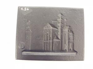 Eisenguss; geschwärzt; Querformat; Nachguss; Die ursprünglich für das Neujahr 1837 in der Sayner Hütte hergestellte Neujahrsplakette zeigt den Blick von Nordosten auf die Benediktinerabteikirche Maria Laach. Die Klosterkirche ist eine doppelchörige, dreischiffige Gewölbebasilika mit zwei Querhäusern und Chören und entsprechenden Türmen im Osten und Westen. Vor dem Westbau liegt das sog. Paradies. Auf dem Gelände ihrer Burg war 1093 die Benediktinerabtei von Pfalzgraf Heinrich II. und seiner Gemahlin Adelheid am Ufer des Laacher Sees zu Ehren der Muttergottes du des hl. Nikolaus gestiftet worden (Baugbeginn). Bei dieser Plakette handelt es sich um einen Nachguss der 1970er Jahre aus der Kunstgießerei Buderus in Hirzenhain. Die Neujahrskarte zeigt die Aufschrift: "SAYNERHÜTTE MDCCCXXXXVII / KLOSTER LAACH." Modell: Carl Christian Kramer. Vergleiche Leihgabe: Röntgen Museum Neuwied (Inv.-Nr.: Roentgen 4615).