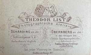 Zu sehen ist ein Kleinkind, welches man im Fotoatelier auf einen Hocker gesetzt hat. Über und um den Hocker herum hat man ein Tuch gespannt. Das Kind ist nur mit einem dünnen Hemd bekleidet, die Füße sind nackt. Die Haare sind nach links gescheitelt. Das Kind sitzt aufrecht und blickt den Fotografen direkt an. Unter dem Foto sind der Name und der Sitz des Fotoateliers angegeben.