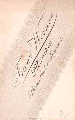 Zu sehen ist ein kleines Kind, das man im Fotoatelier auf eine Fußbank gesetzt hat. Es ist mit einem Kleidchen bekleidet, die Füße sind nackt. Die Haare sind links gescheitelt. Das Kind sitzt aufrecht, die rechts Hand ruht auf dem rechten Oberschenkel, die Linke stützt sich auf die Bank. Unter dem Foto sind der Name und der Sitz des Fotoateliers vermerkt.