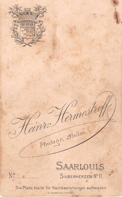 Zu sehen ist ein Kleinkind von ca. einem Jahr. Es sitzt auf der großen, geschwungenen Kante eines Korbes. Der Henkel des Korbes ist mit allerlei Blumen geschmückt. Das Kind ist, bis auf ein kurzes Hemd, nackt. An des linken Schulter des Hemdes befindet sich eine Schleife. Unter dem Foto sind der Name und der Sitz des Ateliers vermerkt.