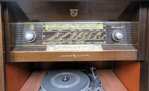 Die Radio/Phono Kombination. von Loewe Opta, Typ 2929 wurde 1957/1958 gebaut. Es ist ein Standgerät mit Holzkorpus, der dunkel furniert und hochglanz lackiert ist. Die Vorderfront hat 2 Schiebeelemente mit denen die Truhe entweder ganz geschlossen, oder aber die linke bzw. rechte Seite geöffnet werden konnte. Das eingebaute Radio ist der Modell Rheingold, von Loewe Opta. Über Drucktasten werden die Wellenbereichen LW/MW/KW und/ UKW sowie AUS und PHONO gesteuert. In einer 2. Reihe gibt es weitere Drucktasten, für ein individuelles Klangbild. Gewählt werden kann zwischen Solo, Jazz, Sprache und Orchester. Mit zwei weiteren, vertikal angeordnete Drehregler, werden die Höhen bzw. Bässe regiuliert. Die 3 Lautsprecher, die unterhalb der Schiebetüren über die gesamte Breite angeordnet sind, ergeben einen vollen den Klang. Der Ladenpreis 1957 für diese Musiktruhe lag bei ca. 750 DM Ursprünglich hatte der Hersteller einen 10er Platten-Wechsler der Firma Perpetuum & Ebner, Typ REX A4 eingebaut. Der Besitzer hat ihn später durch einen DUAL 1224 ersetzt.