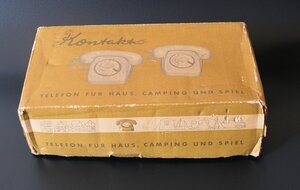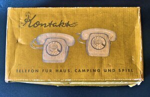 Batterie gespeistes Telefon für Kinder. Beide Telefone werden über 2 Drähte verbunden und so ein geschlossener Stromkreis hergestellt. Erforderlich sind, für beide Telefone, je 1 Batterie mit 4,5 Volt. Für sie gibt es an der Unterseite einen speziellen Halter. Der Hersteller wirbt auf der Verpackung auch für einen Gebrauch bei Canping oder im Haus. Leider ist es uns nicht gelungen den Hersteller zu ermitteln.