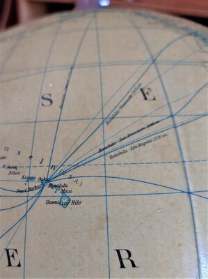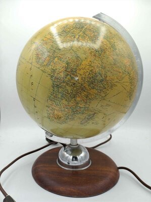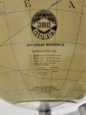 Der Globus ist von der Marke JRO, die vom JRO Verlag München 12 hergestellt wurde. Der Globus ist im Maßstab 1:50.000.000 angefertigt. Er trägt des Weiteren die Kennung: JRO - Landkartendruck v. Joh. Roth sel. Ww. München. Bei den ganzen Linien auf dem Globus handelt es sich um Reise und Handelsrouten, Eisenbahnlinien sind dünn und grau eingezeichnet, Schifffahrtslinien dick und blau und die Fluglinien dünn und blau. Das macht den Globus ein wenig unübersichtlich. Der Globus ist in einem guten Zustand erhalten, das elektrische Licht im Inneren funktioniert auch noch. Nur auf der Oberfläche ist auf einer Stelle etwas von der Karte abgeblättert. Interessant ist, dass auf dem Globus ein "Grosser oder Stiller Ozean" eingezeichnet ist, der heute allgemein als der Pazifische Ozean bekannt ist. Des Weiteren gehört dieser Globus zu den Globen, auf denen die Phantominsel Byers-Insel im Nordpazifik eingezeichnet ist, eine Insel die von Benjamin Morrell frei erfunden wurde (WIKIPEDIA). Da die Globen mit dieser Phantominsel nur in einem kurzen Zeitraum hergestellt wurden, kann man den Globus auf die Zeit um 1960 datieren.