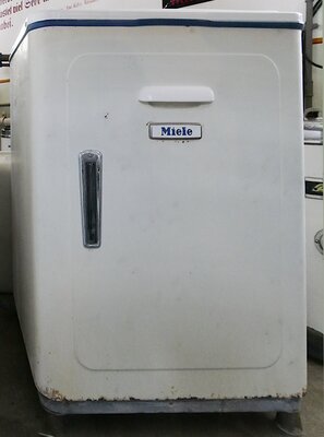 Trommelwaschmaschine. Toplader, der von oben mit der Wäsche beladen wird. Die Maschine besitzt einen Motor zum Bewegen der Trommel mit 0,18 kW und eine Heizung mit 4 kW. Beides für eine Spannung von 220 V. Das Waschmaschineninnere mit der auf einer horizontalen Achse sitzenden Trommel ist mit einem losen Deckel abgedeckt. Hinter diesem befindet sich ein Bedienfeld mit Drehregler einer Statusanzeigelampe und einer Temperaturanzeige. Wir bedanken uns beim MIELE-Museum für die ausführlichen Informationen zu dieser Waschmaschine.