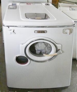 Frontlader und erster Waschvollautomat der Firma Miele. Die "Miele 700" konnte noch nicht schleudern. Der Motor der Waschmaschine hatte eine Leistung von 500 Watt. Die Heizung mit 300 bzw. 6300 Watt benötigte Drehstrom. An der Frontseite befindet sich die runde Tür mit großem Griff zum Befüllen und ein weiteres Bullauge. Über der Türe ist eine Plakette mit der Aufschrift Miele und rechts davon ein Drehregler zum Einstellen der Temparatur und links von der Plakette Drehregler für die Wasserzufuhr. Oben auf der Maschine ist eine Klappe für das Waschmittel, ein Drehgriff, eine Temperaturanzeige, eine Statusleuchte, hinten die Aufschrift Miele 700 und hinter dieser befinden sich Lüftungsschlitze. Wir bedanken uns beim MIELE-Museum für die ausführlichen Information zu dieser Waschmaschine.