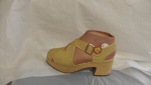 Ein Paar Blaue Herren-Sandalen aus Leder. Die Schuhe haben eine Runde Form, einen Keilabsatz (3 cm) und einen Plateau von 2 cm. Sie verfügen über einen Riemen vorne am Fuß mit Schnallenverschluss, genauso wie einen Riemen hinten am Fuß. Vorne und seitlich sind die Riemen überkreuzt.