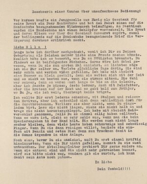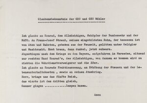 Eine kleine Sammlung von insgesamt sieben Zetteln mit humoristischen Inhalten. Die Zettel scheinen wohl privat gedruckt bzw. kopiert worden zu sein. Da die Zettel verschiedene Größen besitzen und unterschiedliche Papierarten verwendet wurden, entstand die Sammlung vermutlich nicht auf einmal, sondern über einen längeren Zeitraum. Beschriftet sind die Texte mit humoristischen Texten, wie z.B. der Psychoanalyse des Pinkelns, dem Glaubensbekenntnis der CDU-Wähler und einer Neuinterpretation des Erlkönigs. Es finden sich jedoch keine Hinweise wer die Zettel wann gedruckt hat. Das einzige Datum findet sich auf einem Zettel mit nicht jugendfreien Verkehrsschildern. Diese sollen angeblich ab dem 31. Februar 1970 gültig werden. Dieses Datum könnte darauf hinweisen, dass dieser Zettel um Fasching des Jahres 1970 entstand. Die übrigen Zettel könnten dementsprechend auch etwas mit Karneval zu tun haben, z.B Teil einer Büttenrede sein. Einigen Anspilungen nach entstanden die Zettel wohl im Raum Trier.