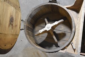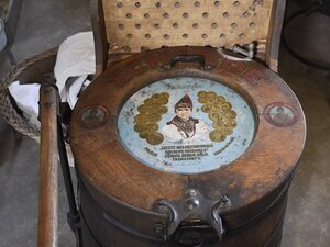 "Schaede's Schnell-Waschmaschine". Modell Schwedin des Herstellers Max Schaede Fabrik für Haushaltsmaschinen Die Holzbottichwaschmaschine ist nicht motorisiert. Das Rührwerk wirt durch einen per Hand hin- und herzubewegenden Hebel angetrieben. Dieser befindet sich oberhalb des Kessels. Mit ihm können die Rührflügel über ein bis unter den Boden des Kessels reichendes Gestänge angetrieben werden. Anstatt der Wringmaschine späterer Modelle besitzt die Maschine eine Wäschepresse mit Eisenspindel, mit der ein Teil des Wassers aus der Wäsche herausgepresst werden kann. Der Kessel der Maschine wird mit zwei Metallreifen zusammengehalten und steht auf drei Beinen. Auf dem Deckel und auf der Wand des Bottichs befindet sich mehrfach die Firmen- und die Markenbezeichung sowie das Markenlogo. In der Mitte des hölzernen Deckels befinden sich auf hellblauem Grund des Markenlogo umrahmt von den Abbildung von Medallien, die Schaede-Waschmaschinen als Auszeichung verliehen worden sind. Aufgrund des aufwendig gestalten Dekors ist davon auszugehen, dass es sich bei der Maschine um ein Messe- oder Ausstellungsexemplar handelt. Zum Hersteller: Zu den wichtigsten Industriezweigen in Saalfeld (Thüringen) gehörte der Bau von Waschmaschinen. Seit 1888 wurden hier von zahlreichen Firmen Rührflügelmaschinen hergestellt. Der Waschmaschinenbau endete erst 1968. Das Unternehmen "Max Schaede Fabrik für Haushaltsmaschinen" wurde 1888 in Saalfeld gegründet. Die Firma produzierte Buttermaschinen und Mangel-Tische. Ab1928 werden elektrische Waschmaschinen unter der Schutzmarke Schaede Elektra produziert. Nach Ende des Zweiten Weltkriegs und weitgehender Zerstörung der Industrieanlagen werden die Fabrikbesitzer zwangsenteignet. Provisorisch aufgebaute Produktionsstätten stellen Haushaltsgeräte und Maschinen her. "Max Schaede" wird zur Saalfelder Waschmaschinenfabrik und fusioniert 1949 mit der Saalfelder Bohrmaschinenfabrik. Mit weiteren Firmen entsteht die VEB Werkzeugmaschinenfabrik Saalfeld. Die heutige SAMAG Group geht aus all diesen Unternehmen hervor.