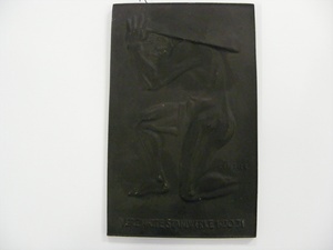 Eisenguss; Hochformat; Die Concordiahütte der Vereinigten Stahlwerke in Bendorf-Mülhofen brachte in den 1930-40er Jahren anlässlich des Neujahrs Eisengussplaketten heraus. Für das Neujahr 1930-31 wählte man als Motiv in Seitendarstellung einen muskulösen, nackten, auf dem linken Bein knieenden Mann, der auf Schulter und Kopf eine Last hält. Bei dem hier abgebildeten Exemplar handelt es sich um einen Nachguss von Anton Schmidt aus der Zeit um 1973. Die Plakette zeigt auf der Vorderseite die Beschriftung "VEREINIGTE STAHLWERKE 1930-31" sowie die Signatur des Modelleurs ""GEISSLER". Modell: Geissler; Nachguss Anton Schmidt Concordia-Hütte um 1973