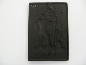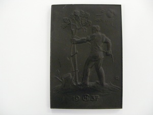 Eisenguss; Hochformat; Nachguss Anton Schmidt Concordia-Hütte um 1973 Die Concordiahütte der Vereinigten Stahlwerke in Bendorf-Mülhofen brachte in den 1930-40er Jahren anlässlich des Neujahrs Eisengussplaketten heraus. Für das Neujahr 1930 wählte man folgendes Motiv: Ein Mann (Rückenansicht) bindet einen jungen Eichenbaum, der aus einem Baumstumpf herauswächst, an einen Stützpfahl an. Mit seiner Linken hält er den Baum und mit seiner Rechten bindet er ihn an. Darüber ist die Sonne dargestellt. Die Szene wird als Wiederbelebung des Eisenkunstgusses gedeutet. Bei der hier abgebildeten Plakette handelt es sich um einen Nachguss von Anton Schmidt aus der Zeit um 1973. Die Plakette zeigt auf der Vorderseite die Beschriftung "MH" (Signatur des Modelleurs) und "19 CH 37" (CH = Concordiahütte).