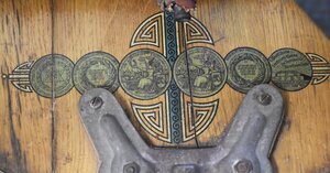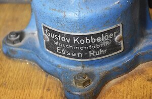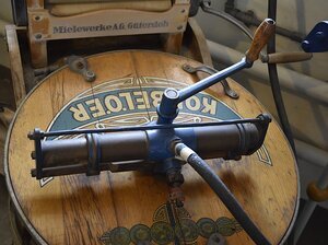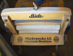 Waschmaschine mit Holzbottich und Rührwerk des Herstellers Gustav Kobbelöer, Maschinenfabrik, Essen. Der Holzbottich wird/wurde von 3 Metallriemen zusammengehalten. Auf dem Decke befindet sich die Aufschrift Kobbelöer in einem Art Deco- Rahmen. Ebenso die Abbildung von 6 Medaillen, die wohl Auszeichnungen von verschiedenen Messen sind. Die neueste von diesen mit mit 1931 datiert. D.h. die Waschmaschine kann frühestens 1931 hergestellt worden sein. Die Waschmaschine besitzt keinen Motor. Der Waschkranz wurde durch Wasserkraft angetrieben. Man machte sich die Kraft des unter Druck stehenden Leitungswassers zunutze welches einen auf dem Deckel angeschraubten Kolben hin- und her bewegt. Damit wird das Rührwerk der Waschmaschine, das auf der Innenseite des Deckels angebracht ist, in Gang gesetzt. Auf der Maschine steht der Miele Wäschewringer 33/35.