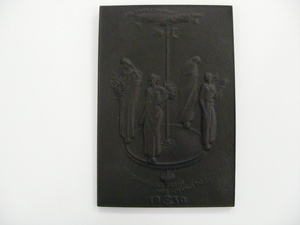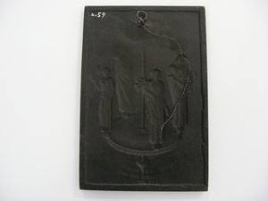 Eisenguss; Hochformat; Nachguss; Die Concordiahütte der Vereinigten Stahlwerke in Bendorf-Mülhofen brachte in den 1930-40er Jahren anlässlich des Neujahrs Eisengussplaketten heraus. Für das Neujahr 1939 wählte man folgenes Motiv: Vier Frauen, die die vier Jahreszeiten symbolisieren, stehen auf einem Karussell bzw. einer Drehscheibe. Über ihnen sind Sonne, Mond, Wolke und Sterne dargestellt. Es handelt sich um einen Nachguss von Anton Schmidt aus der Zeit um 1973. Die Plakette zeigt auf der Vorderseite die Beschriftung "DAS JAHR SICH DREHT / HAT KEINE RUH" "ES KOMMT UND GEHT / WIE ICH UND DU" "19 CH 39".