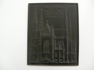 Eisenguss; geschwärzt; Hochformat; Nachguss der Kunstgießerei Buderus Hirzenhain; Die anlässlich des Neujahrs 1847 produzierte Sayner Neujahrsplakette zeigt den Blick von Süden auf die nach Plänen des Kölner Dombaumeisters Ernst Friedrich Zwirner in den Jahren 1838-1843 erbauten St. Apollinariskirche bei Remagen am Rhein. Es handelt sich bei der Apollinariskirche, um den wohl bedeutendsten neugotischen Sakralbau im Rheinland. Als einschiffiger Bau erhebt sich die Kirche über dem Grundriss eines griechischen Kreuzes. In die östlichen Winkel des Kreuzes und an die Westfassade sind je zwei Türme gestellt. Den baufälligen Vorgängerbau hatte Graf von Fürstenberg-Stammheim1838 abreißen lassen und Zwirner die Planungen für einen Neubau übertragen. Wie der frühere Denkmalpfleger und Architekt Dr. Paul-Georg Custodis feststellen konnte, sind die gusseisernen Maßwerkhelme der Westtürme auf der Eisenhütte in Isselburg (Niederrhein) und nicht in Sayn gegossen worden. Modell: Wilhelm Samuel Weigelt. Vergleiche Leihgabe: Röntgen Museum Neuwied (Inv.-Nr. Roentgen 4261).
