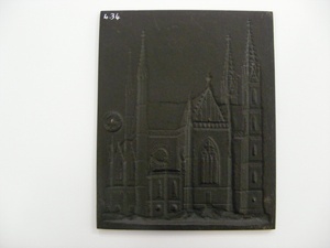 Eisenguss; geschwärzt; Hochformat; Nachguss der Kunstgießerei Buderus Hirzenhain; Die anlässlich des Neujahrs 1847 produzierte Sayner Neujahrsplakette zeigt den Blick von Süden auf die nach Plänen des Kölner Dombaumeisters Ernst Friedrich Zwirner in den Jahren 1838-1843 erbauten St. Apollinariskirche bei Remagen am Rhein. Es handelt sich bei der Apollinariskirche, um den wohl bedeutendsten neugotischen Sakralbau im Rheinland. Als einschiffiger Bau erhebt sich die Kirche über dem Grundriss eines griechischen Kreuzes. In die östlichen Winkel des Kreuzes und an die Westfassade sind je zwei Türme gestellt. Den baufälligen Vorgängerbau hatte Graf von Fürstenberg-Stammheim1838 abreißen lassen und Zwirner die Planungen für einen Neubau übertragen. Wie der frühere Denkmalpfleger und Architekt Dr. Paul-Georg Custodis feststellen konnte, sind die gusseisernen Maßwerkhelme der Westtürme auf der Eisenhütte in Isselburg (Niederrhein) und nicht in Sayn gegossen worden. Modell: Wilhelm Samuel Weigelt. Vergleiche Leihgabe: Röntgen Museum Neuwied (Inv.-Nr. Roentgen 4261).