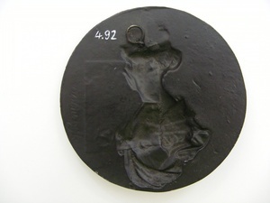 Eisenguss; geschwärzt; Bildnismedaillon; Nachguss; Das Bildnismedaillon zeigt ein Brustbild im Profil nach rechts von Luise, Königin von Preußen (1776-1810), mit Perlenkette unter Tuchdraperie und Diadem. Luise, Tochter des Herzogs Karl II. Ludwig Friedrich von Mecklenburg-Strelitz, heiratete 1793 Friedrich Wilhelm, Prinz von Preußen (ab 1797 als Friedrich Wilhelm III. König von Preußen). Das Originalmodell stammt von Leonhard Posch (um 1810). Es handelt sich bei diesem Medaillon um einen Nachguss von Anton Schmidt aus der Zeit um 1973. 1804, gleichzeitig mit der Eröffnung der königlich-preußischen Eisengießerei in Berlin kam der Tiroler Leonhard Posch nach Berlin. Er porträtierte die Berühmtheiten aus der Zeit der Befreiungskriege in Wachs. Die danach gefertigten Modelle für Bildnismedaillons, Plaketten und Reliefs wurden in allen drei königlich-preußischen Gießereien (Gleiwitz, Berlin und Sayn) abgegossen. Modell: Leonhard Posch;
