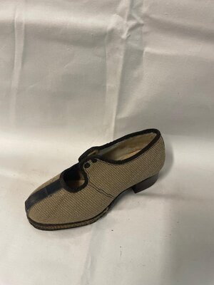 Ein Einzelner Schwarzer Pumps aus Stoff. Der Schuh hat eine Runde Form und einen metallgenagelten, mit Stoff bezogenen Absatz (4,5 cm).Er verfügt über Glitzerpailetten vorne auf dem Schuhblatt und über Ziernähte. Hergestellt in Frankfurt für die Marke "Jean Hesse".