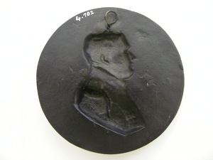 Eisenguss; geschwärzt; Bildnismedaillon; Nachguss; Das Bildnismedaillon zeigt das Brustbild im Profil nach links von Napoleon I. Bonaparte, Kaiser der Franzosen (1769-1821; 1804 Kaiser). Napoleon hier in der Uniform eines Obersten der Grenadiergarde mit Kreuz und Stern der Ehrenlegion und dem Orden der Eisernen Krone. Das Originalmodell stammt von Leonhard Posch (1807). Es handelt sich bei diesem Medaillon um einen Nachguss von Anton Schmidt aus der Zeit um 1973. 1804, gleichzeitig mit der Eröffnung der königlich-preußischen Eisengießerei in Berlin kam der Tiroler Leonhard Posch nach Berlin. Er porträtierte die Berühmtheiten aus der Zeit der Befreiungskriege in Wachs. Die danach gefertigten Modelle für Bildnismedaillons, Plaketten und Reliefs wurden in allen drei königlich-preußischen Gießereien (Gleiwitz, Berlin und Sayn) abgegossen. Neben den Herrschern insbesondere der preußischen Königsfamilie, Feldherren und hohen Beamten war es vor allem das „Letzte Abendmahl“ von Leonardo da Vinci, das Leonhard Posch 1822 nach einem Kupferstich von Raffael Morghen, schuf. Modell: Leonhard Posch;