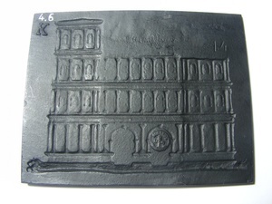 Eisenguss; Relief; Querformat; Nachguss der Kunstgießerei Buderus Hirzenhain um 1973; Das auf der Plakette für das Neujahr 1822 abgebildete Monument zeigt eine Ansicht der Porta Nigra von Norden nach der Entfernung der Doppelkirchenanlage. Die aus dem letzten Viertel des 2. Jahrhunderts n. Chr. stammende römische Toranlage war seit dem 11. Jahrhundert von dem angrenzenden Simeonstift als Kirchenanlage aus- und umgebaut worden ohne die römische Bausubstanz wesentlich zu verändern. Nach Einzug der französischen Revolutionstruppen wurde die Kirche demontiert. 1805 kam der Abbruch der mittelalterlichen Einbauten zum Erliegen, bis er 1815-1817 unter preußischer Regierung abgeschlossen und die Porta Nigra schließlich 1822 als Stadttor wieder eröffnet wurde. Bei dieser Plakette fehlt der preußische Adler mit der Banderole, auf der geschrieben steht "SAYNER HÜTTE 1822" (vergleiche Inv.-Nr. 4.005). Modell: Heinrich Zumpft, Sayn.