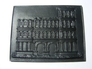Eisenguss; Relief; Querformat; Nachguss der Kunstgießerei Buderus Hirzenhain um 1973; Das auf der Plakette für das Neujahr 1822 abgebildete Monument zeigt eine Ansicht der Porta Nigra von Norden nach der Entfernung der Doppelkirchenanlage. Die aus dem letzten Viertel des 2. Jahrhunderts n. Chr. stammende römische Toranlage war seit dem 11. Jahrhundert von dem angrenzenden Simeonstift als Kirchenanlage aus- und umgebaut worden ohne die römische Bausubstanz wesentlich zu verändern. Nach Einzug der französischen Revolutionstruppen wurde die Kirche demontiert. 1805 kam der Abbruch der mittelalterlichen Einbauten zum Erliegen, bis er 1815-1817 unter preußischer Regierung abgeschlossen und die Porta Nigra schließlich 1822 als Stadttor wieder eröffnet wurde. Bei dieser Plakette fehlt der preußische Adler mit der Banderole, auf der geschrieben steht "SAYNER HÜTTE 1822" (vergleiche Inv.-Nr. 4.005). Modell: Heinrich Zumpft, Sayn.