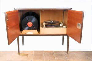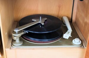 Dieser Eigenbau war ursprünglich eine Kommode, die später zu einem Plattenspieler Schrank umgebaut wurde. In dem rechten Fach hat der ehemalige Besitzer, einen 10er Wechsler Dual 1002/F eingebaut. Im linken Fach sind die Schallplatten untergebracht, die größtenteils aus den 1950er/60er Jahren stammen. (siehe Bild). Alle Schallplatten mit den Umdrehungen 33, 45 und 78 U/min können auf dem Dual 1002/F abgespielt werden. Der Tonabnehmer ist mit einem Kristall-System ausgestattet, das mit 2 Saphiren ausgestattet ist. Der Schallplattenspieler besitzt keine eingene Endstufe, weshalb ein Radio zu Betrieb notwendig ist.