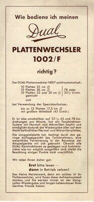 Die Bedienungsanleitung (Faltblatt) für den Dual Plattenwechsler 1002/F besteht aus 8 Seiten in dem Format 10 x 20 cm hochkant. Das Faltblatt enthält die Beschreibung aller Bedienungsteile, deren Gebrauch und Pflege. 7 Fotos veranschaulichen zusätzlich weitere Details der Bedienung.