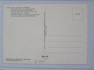 Diese zeitgenössische Postkarte zeigt in einem weißen Feld ein Foto des heiligen Rocks mit ausgebreiteten Ärmeln. Zu sehen sind die Details wie Knitterfalten und Ausbesserungen bzw. Ergänzungen. Oberhalb des heiligen Rocks steht in goldfarbener Schrift: "Der Heilige Rock", unterhalb des Rockes befindet sich, ebenfalls goldfarben, das Christussymbol "PX". Der Untergrund der Postkarte ist lila, darauf ist um den heiligen Rock ein durchbrochenes goldfarbenes Feld gedruckt, die Umrandung und die grafischen Dekore in den Ecken sind ebenfalls goldfarben. Die Rückseite der Postkarte zeigt rechts das Feld für die Adresse, links das Feld für die Beschriftung. Außerdem befinden sich hier die Angaben des Motivs in den Sprachen Deutsch, Englisch und Französisch: Trier - Dom / Cathedral / Cathédrale // DER HEILIGE ROCK - die kostbarste Reliquie der ältesten Bischofskirche Deutschlands // THE HOLY ROBE - The most precious relic of the oldesst bishop's church in Germany // LA SAINTE TUNIQUE d' - la relique la plus précieuse de la plus ancienne église épiscopale d'Allemagne. Unten links steht: "Origanialfoto vom Heiligen Rock: Rita Heyen". Das Copyright liegt beim Domkapitel des Bistums Trier, Layout und Herstellung der Karte beim Verlag Fotokunst Schwalbe in Trier. Die Postkarte befindet sich in einem rahmenlosen Bilderhalter.