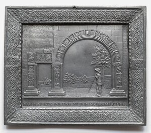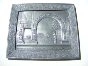 Bleiguss; Modell; Querformat; Diese Neujahrskarte- bzw. Plakette mit Zierrahmen aus Bleiguss hergestellt 1827 für das Neujahr 1828, zeigt als Motiv das Portal zu Remagen am Rhein mit romantischer Landschaft und Wanderer. Auf der Vorderseite fehlt oben links die Beschriftung "SAYNERHÜTTE / MDCCCDXXVIII" und ist stattdessen ersetzt durch ein Mauerwerk. Am unteren Rand ist zu lesen: "VORMALIGES PORTAL ZU REMAGEN AM RHEIN". Dem ersten Entwurf hatte man auf der Sayner Hütte eigenmächtig einen Wanderer mit Landschaft hinzugefügt, was von den vorgesetzten Dienststellen abgelehnt wurde. Daraufhin musste die Sayner Hütte ein neues, bereinigtes Modell für den Guss der Neujahrsplakette anfertigen. Auf der Hütte existierte nach wie vor ein Modell mit romantischer Landschaft und Wanderer, wovon wohl Abgüsse für den offenen Verkauf erstellt wurden. Entwurf: Bernhard Hundshagen, Bonn. Modell: Heinrich Zumpft, Sayn. Vergleiche Leihgabe: Röntgen Museum Neuwied, vormals Kreismuseum Neuwied (Inv.-Nr. Roentgen 4609).