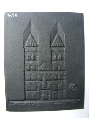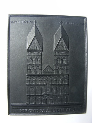 Eisenguss; geschwärzt; Relief; Hochformat; Nachguss der Kunstgießerei Buderus Hirzenhain; Die ursprüngliche Neujahrsplakette wurde anlässlich des Neujahrstages 1832 im Jahre 1831 auf der Sayner Hütte gegossen. Die Plakette zeigt die spätromanische Westfassade der Liebfrauenkirche in Andernach bestehend aus einem Mitteltrakt, flankiert von zwei Türmen mit hohen Rautendächern. Die Fassade gliedert sich in drei Geschosse, die durch profilierte Gesimse voneinander absetzen. Blendarkaden, Rundbogenfriese und Pilaster überziehen die gesamte Fassadenfläche. In der Mitte - oberhalb des Eingangportals - wurde ein ursprünglich gotisches Maßwerk im Jahre 1894 durch ein Rundfenster mit eingelegtem Achtpass ersetzt. Die Vorderseite ist oben mit "SAYNERHÜTTE MDCCCXXXII" und unten mit "KIRCHE ZU ANDERNACH" beschriftet. Auf der Rückseite ist die Gießereimarke der Kunstgießerei Buderus in Hirzenhain zu erkennen. Die Gießerei wurde 2015 geschlossen. Entwurf: Georg Osterwald. Modell: Heinrich Zumpft.