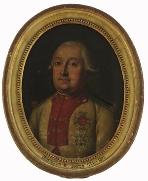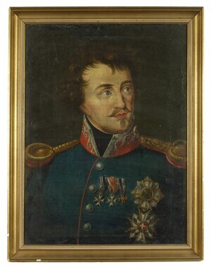Das Porträt zeigt Karoline Friederike Wilhelmine, Prinzessin von Baden und Königin von Bayern. 1797 heiratete sie den verwitweten Maximilian Joseph von Pfalz-Zweibrücken, der 1799 als Maximilian IV. seine Regierung als Herzog von Bayern, Pfalzgraf bei Rhein, Herzog von Jülich und Berg sowie Kurfürst von Kurpfalz-Bayern des Heiligen Römischen Reichs antrat. Am Ende des Dritten Koalitionskrieges im Dezember 1805 wurde Bayern im Vertrag von Brünn und im Frieden von Pressburg durch Napoleon zum Königreich erhoben. Aus dem bayerischen Herzog wurde dadurch im Januar 1806 König Maximilian I. Joseph von Bayern und Karoline von Baden wurde die erste bayerische Königin. Karoline soll Napoleon gegenüber jedoch nicht wohlgesonnen zu sein und stellte sich wohl zunächst auch gegen die Verheiratung ihrer Stieftochter Auguste Amalia mit dem Stiefsohn Napoleons Eugène de Beauharnais. Bemerkenswert ist der Umstand, dass Karoline auch als Königin von Bayern ihren protestantischen Glauben beibehalten durfte, was sich integrierend auf die (neu hinzugekommenen) protestantisch geprägten Regionen - etwa in Franken - innerhalb des eigentlich streng katholischen Bayerns auswirkte. Die Lithografie basiert auf einem Gemälde von Joseph Karl Stieler, der ab 1820 bayerischer Hofmaler war und zahlreiche Porträts der königlichen Familie anfertigte. [Johanna Kätzel]