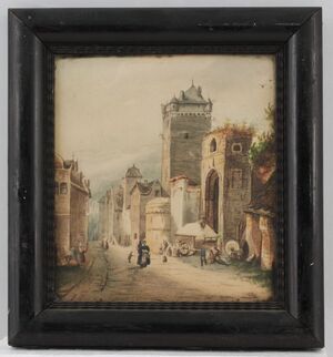 Auf dem Foto blickt man eine Straße hinunter auf die barocke ehemalige Klosterkirche mit einer drei geschossigen Fassade mit zwei Türmen. Dazwischen erhebt sich, etwas dahinter eine Tambourkuppel. Die Straße ist auf der rechten Seite von einem Garten und dann von zwei bis drei geschossigen Wohnhäusern begrenzt. Auf der linken Seite stehen nur Wohnhäuser in gleicher Höhe. Die Fahrbahn ist beinah menschenleer, auf der rechten Seite sieht man ein Straßenbahngleis.
